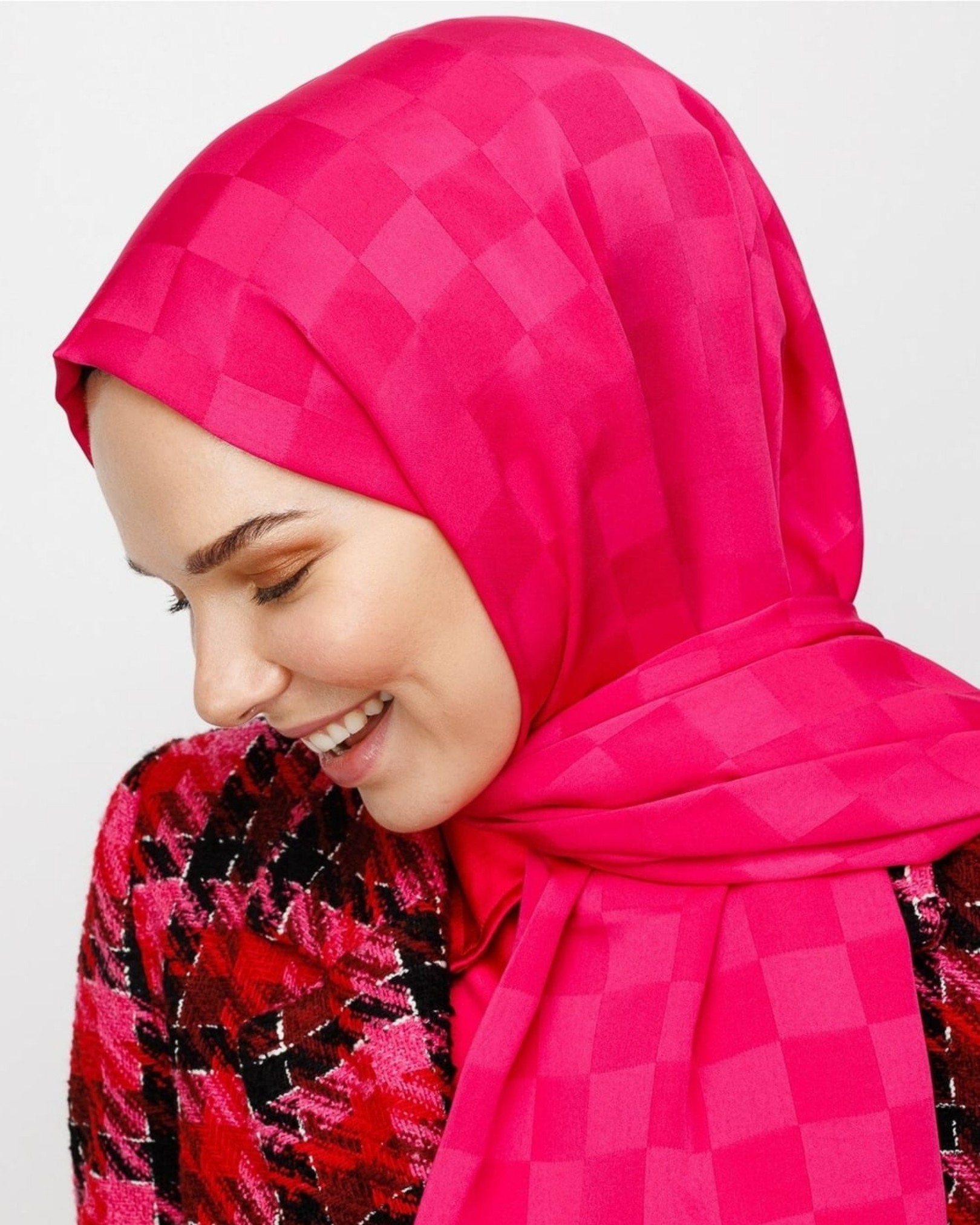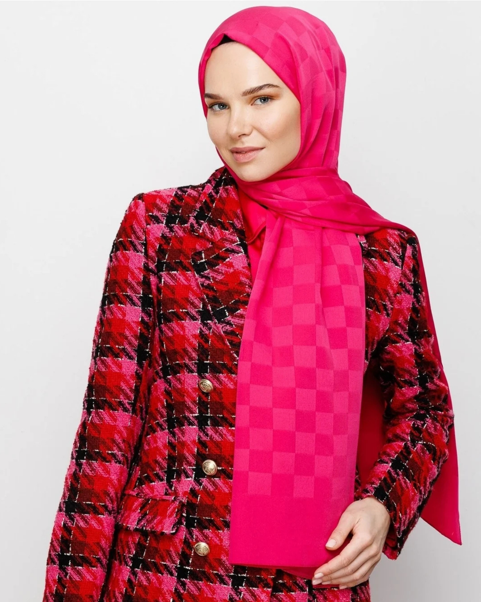 Fuşya Dama Desen İpeksi Jakar Şal (JKRMNC0014)