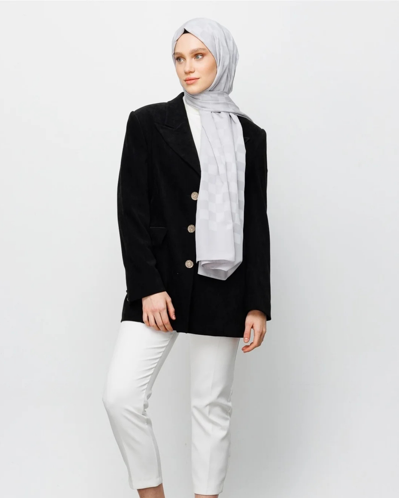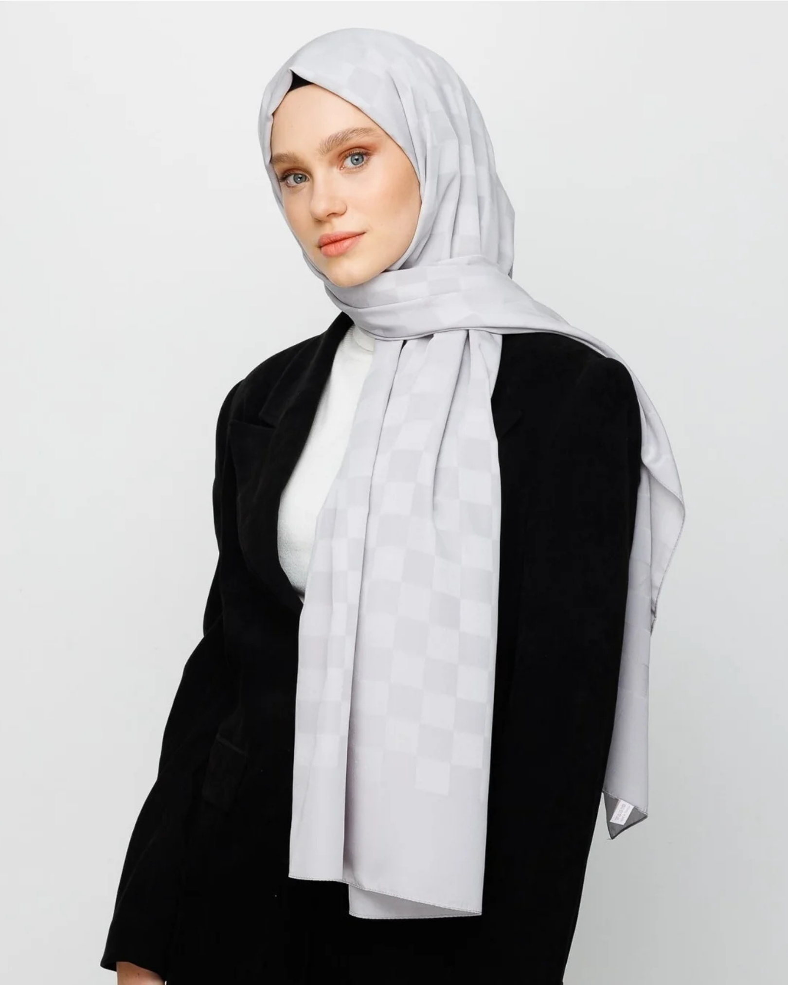 Gümüş Dama Desen İpeksi Jakar Şal (JKRMNC0014)