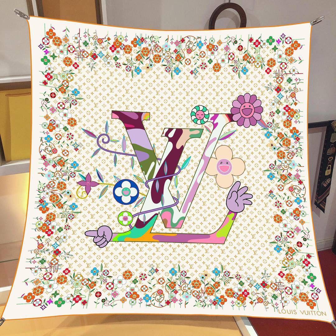 İthal Bej LV Flower Desen Twill İpek Eşarp (LMS589)
