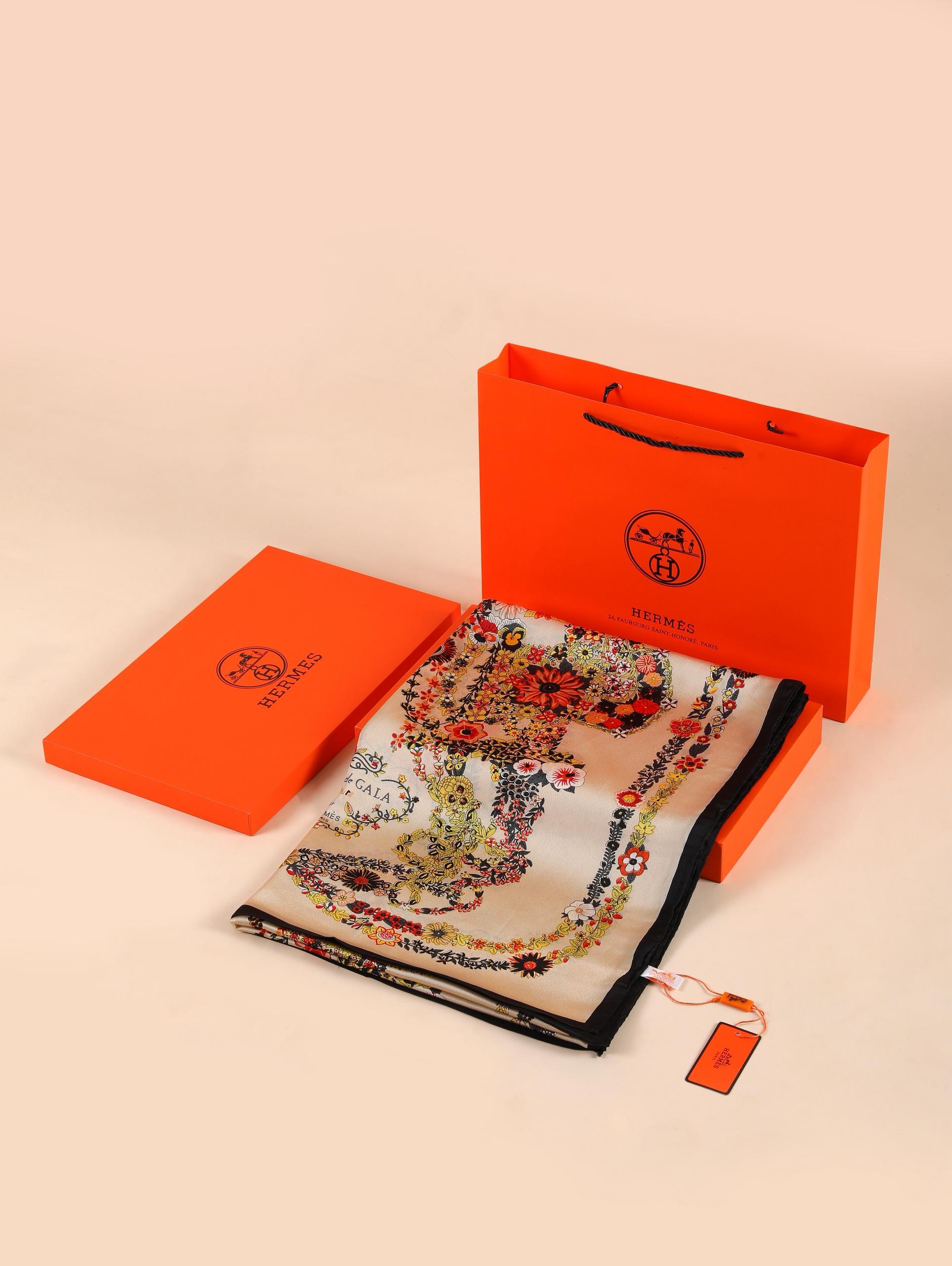 İthal Bej & Siyah H Desen Vual İpek Şal (LMS425)