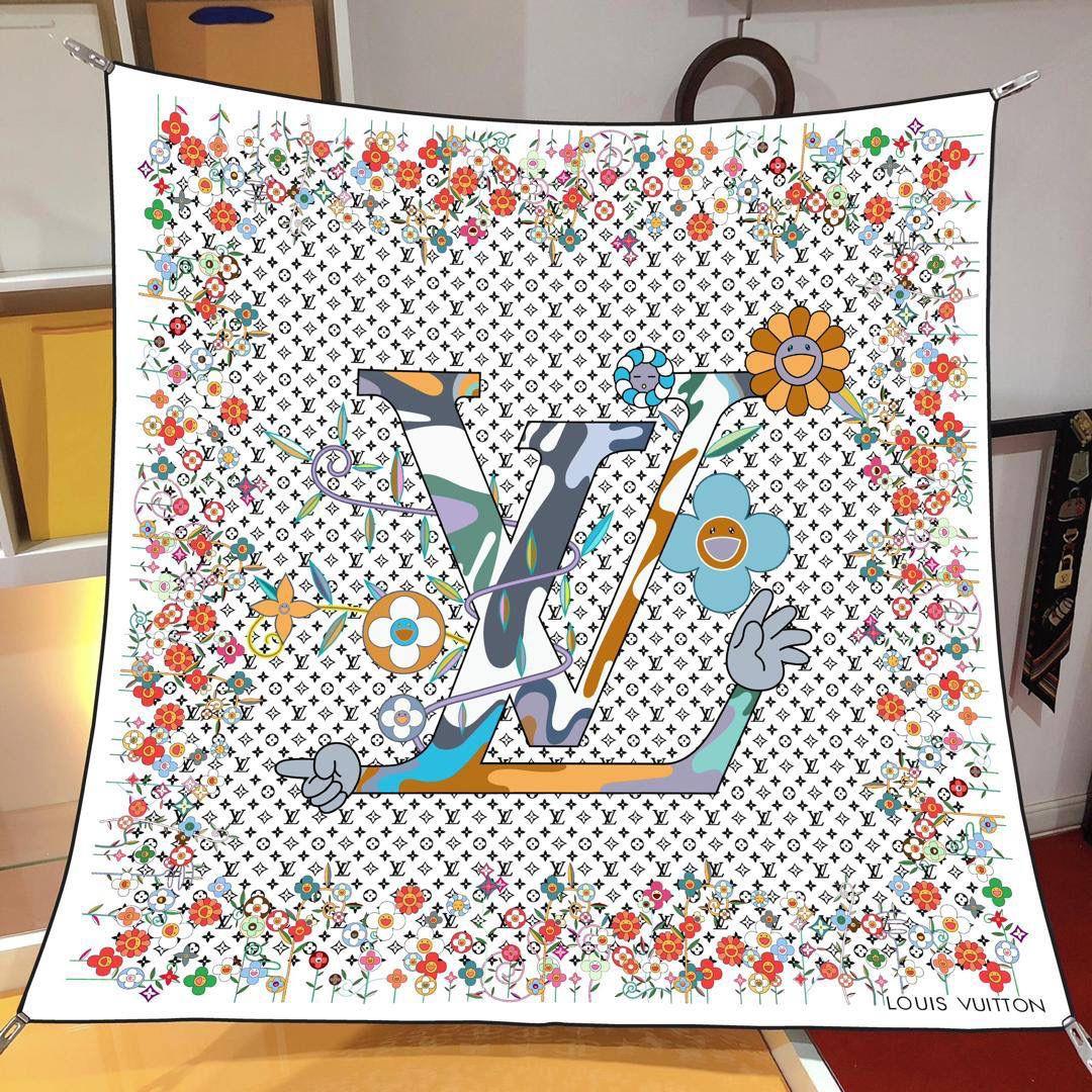 İthal Beyaz LV Flower Desen Twill İpek Eşarp (LMS588)