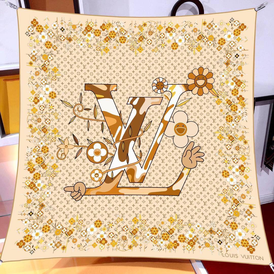 İthal Gold LV Flower Desen Twill İpek Eşarp (LMS591)