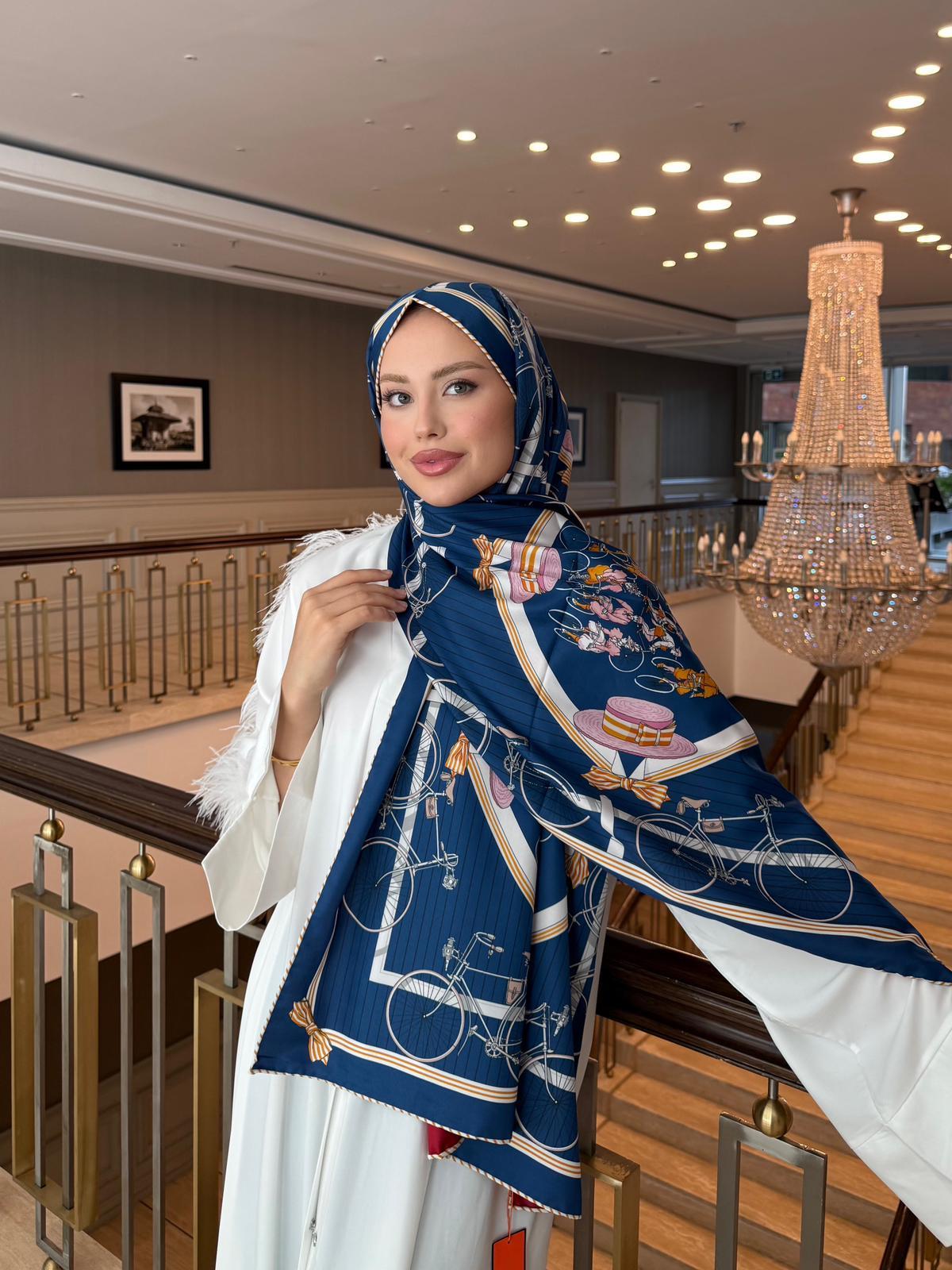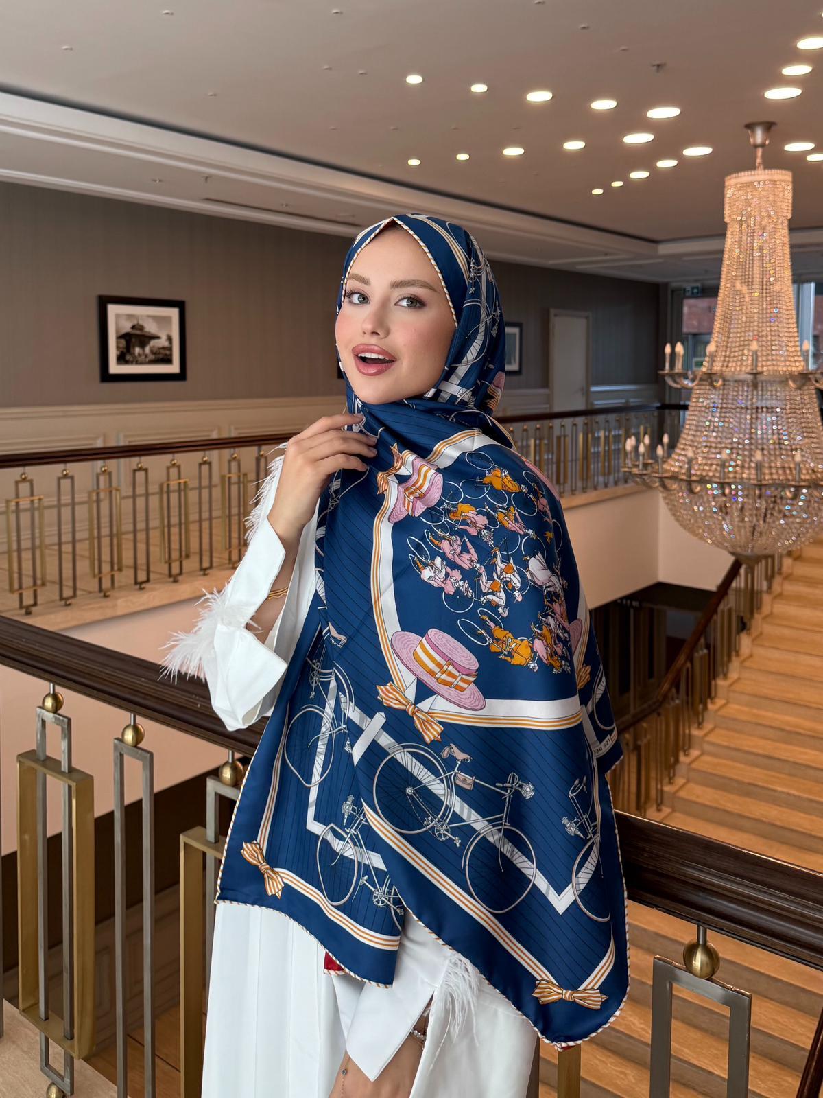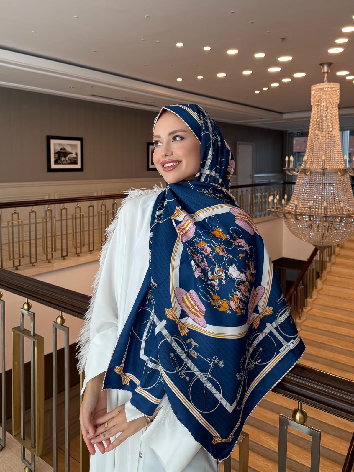 İthal Lacivert & Kırmızı H Desen Twill İpek Şal (LMS337)