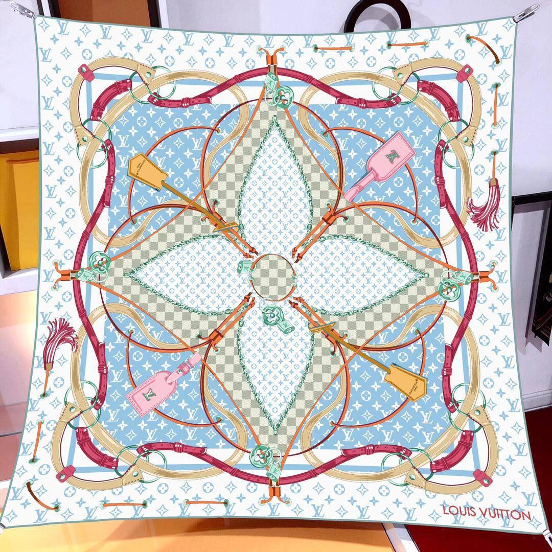 İthal Mavi LV Kilit Desen Twill İpek Eşarp (LMS569)