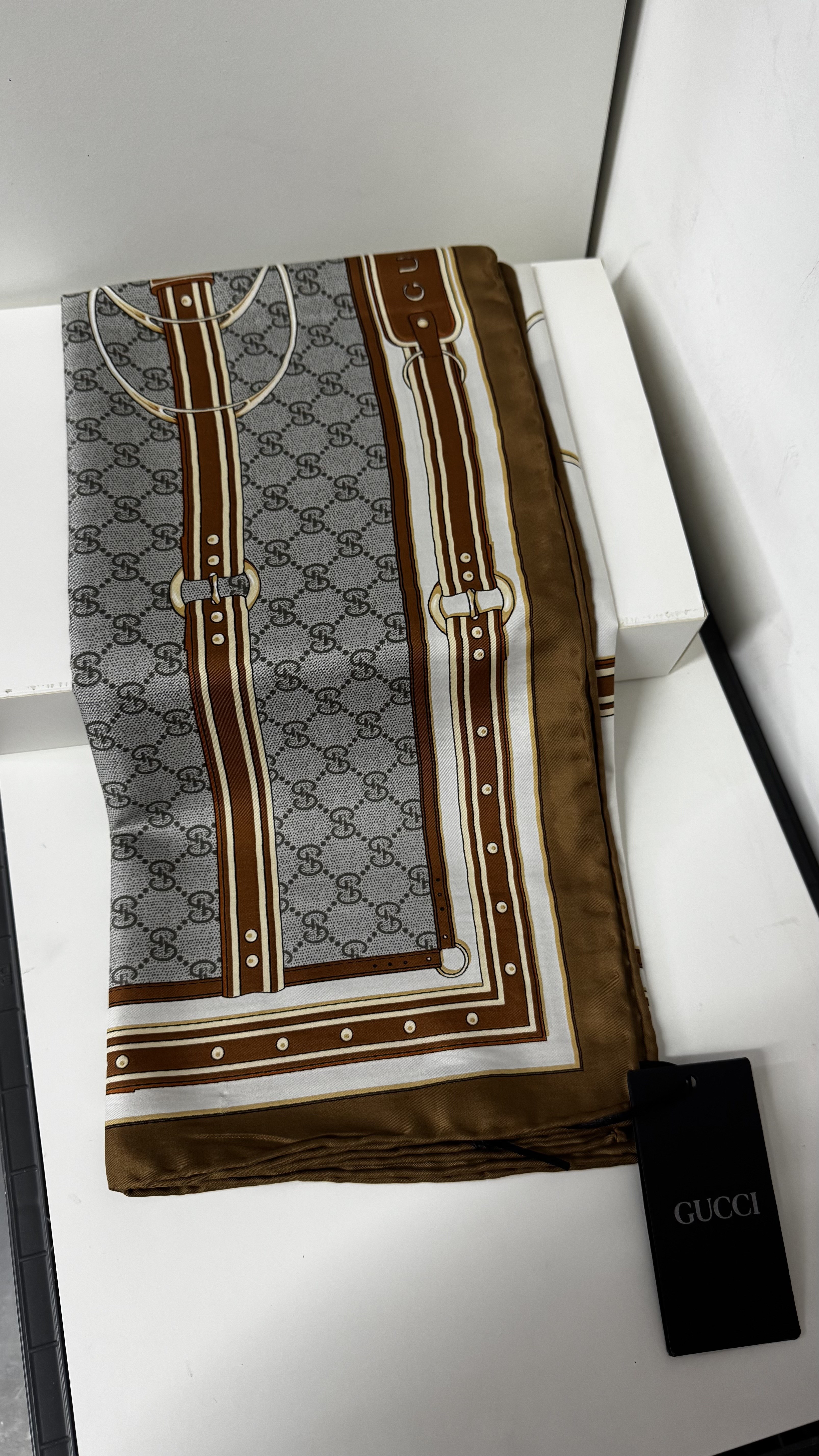 İthal Mocha & Gri G Belt Desen Twill İpek Eşarp (LUKS-E-Tİ-GB-06)