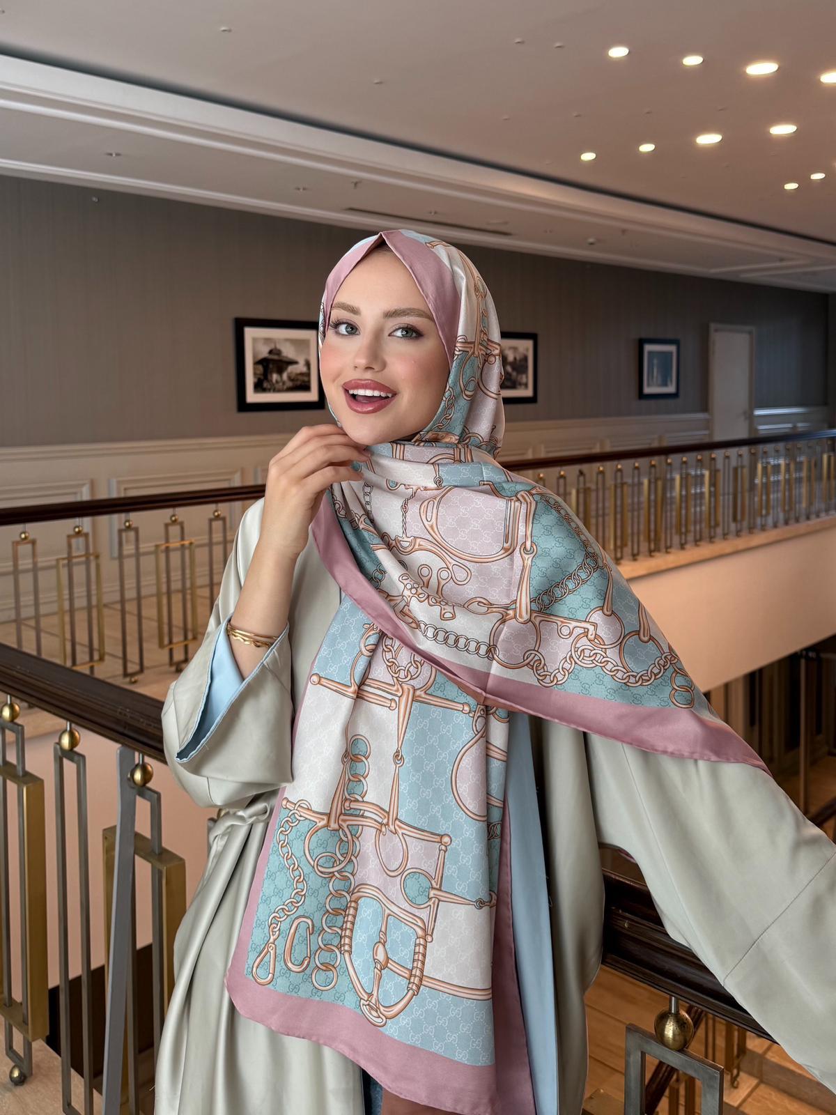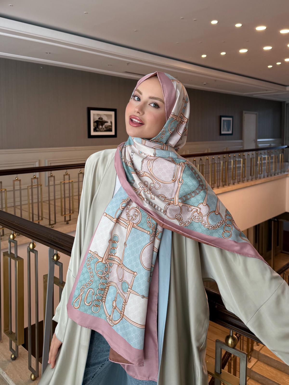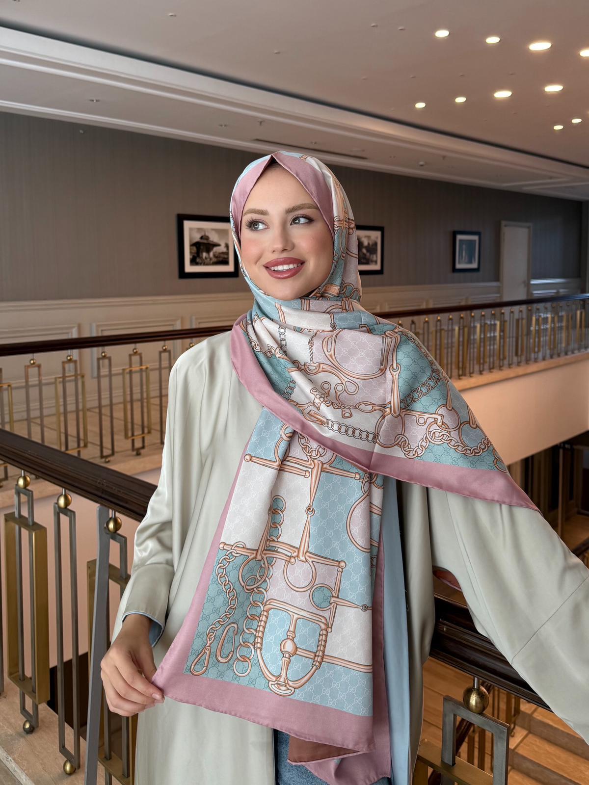 İthal Pudra Pembe & Kiremit GC Zincir Desen Twill İpek Şal (LMS323)