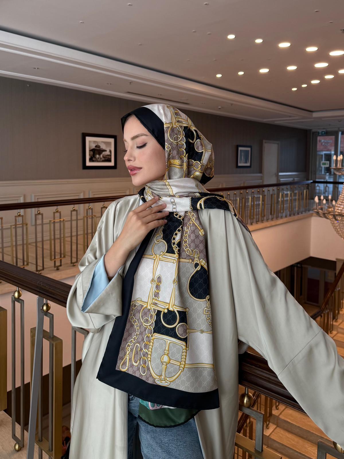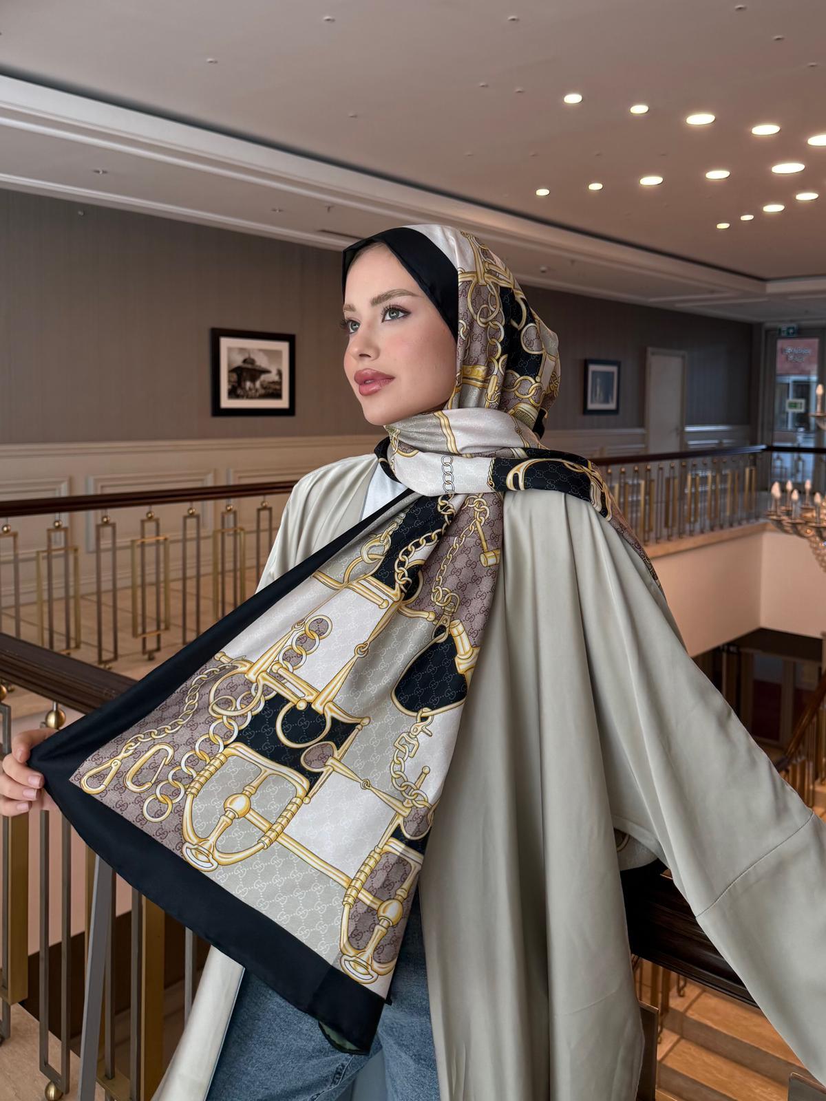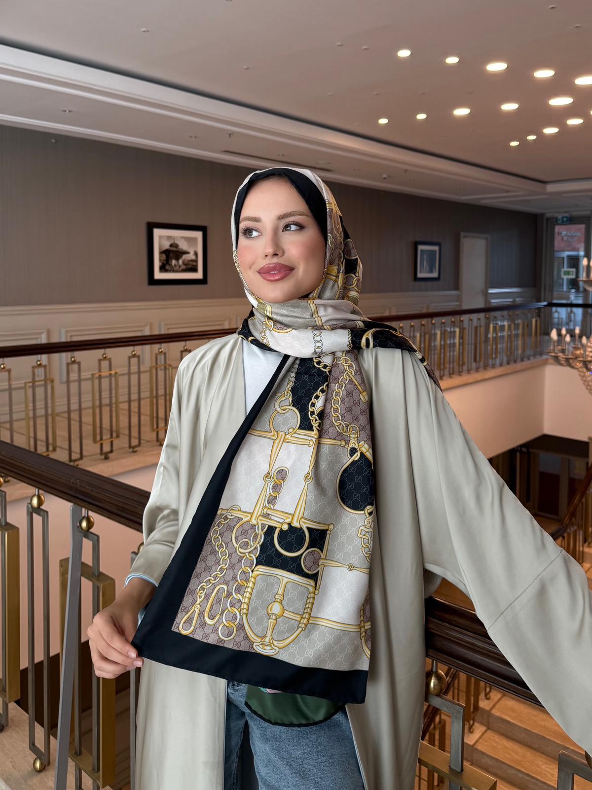 İthal Siyah & Haki GC Zincir Desen Twill İpek Şal (LMS321)