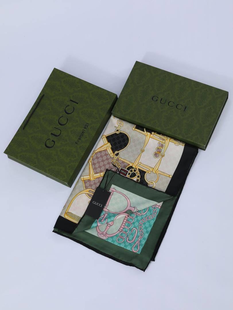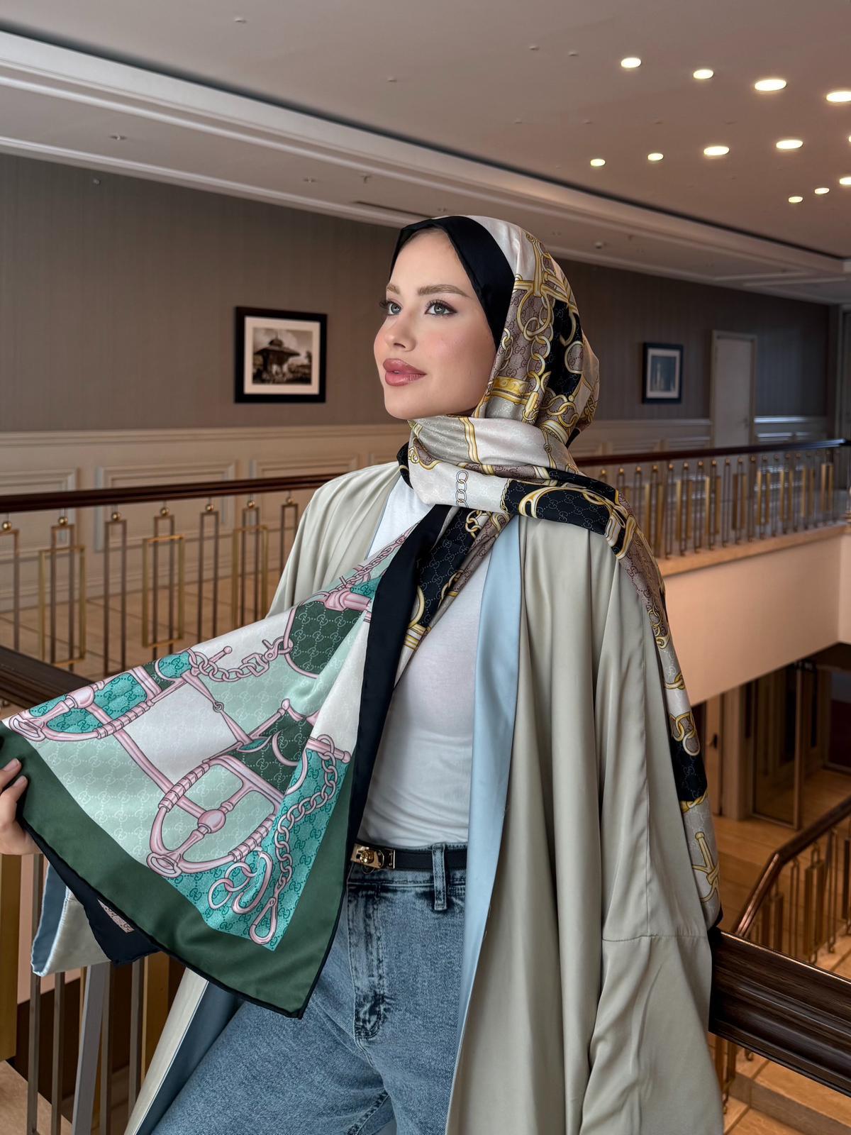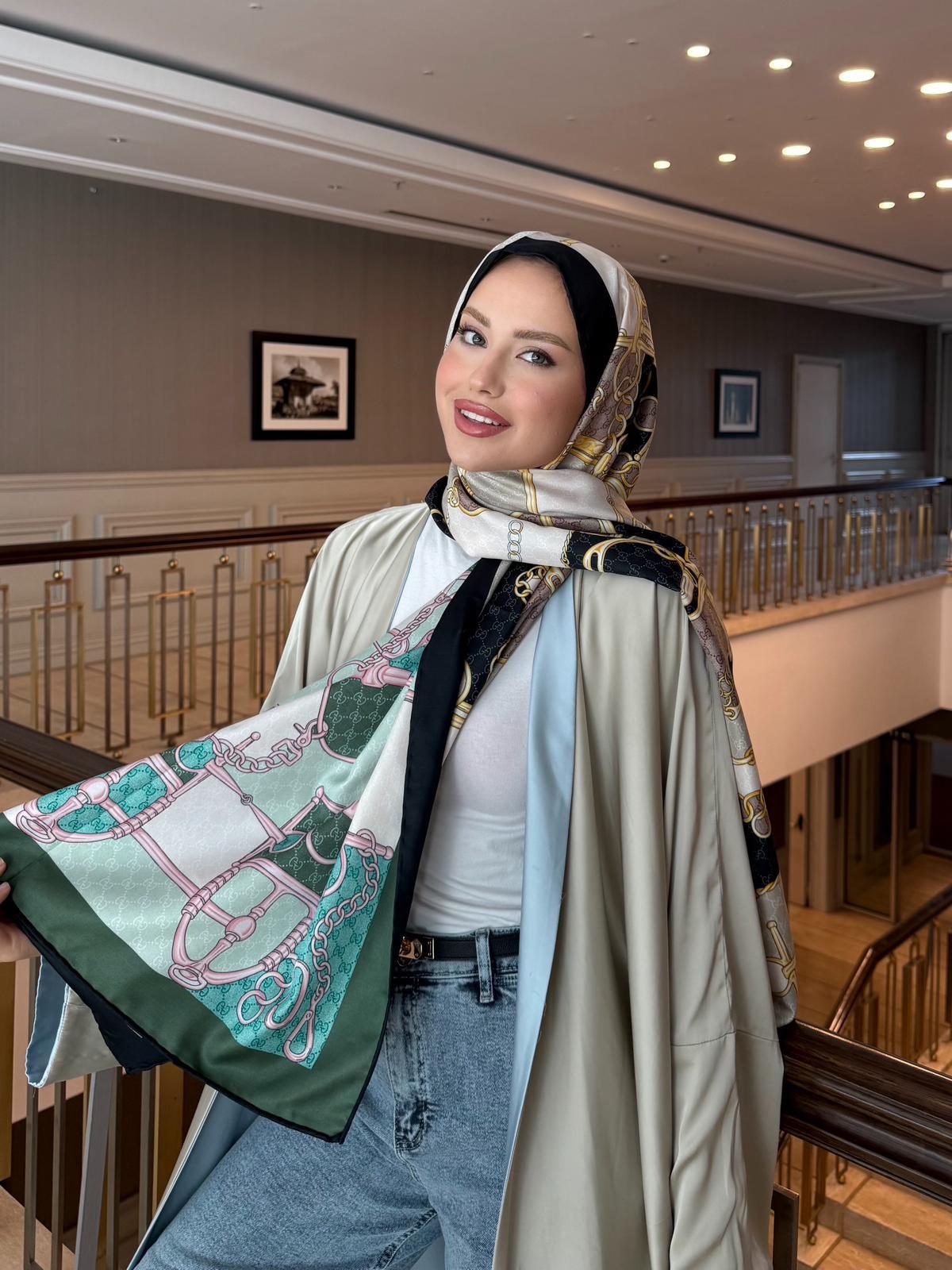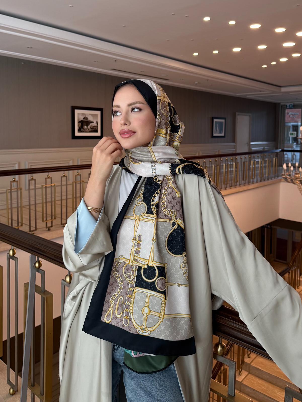 İthal Siyah & Haki GC Zincir Desen Twill İpek Şal (LMS321)