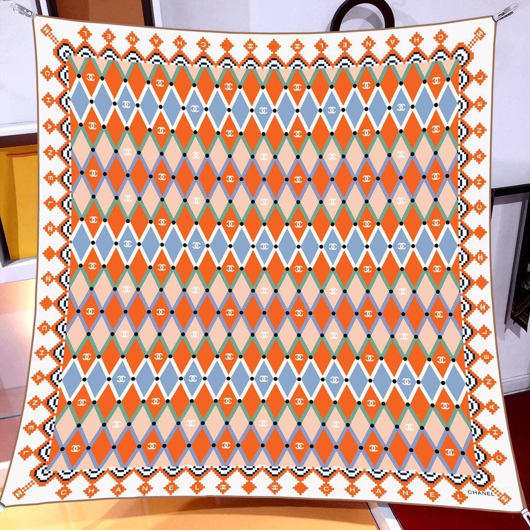İthal Turuncu & Mavi CH Desen Twill İpek Eşarp (LMS581)