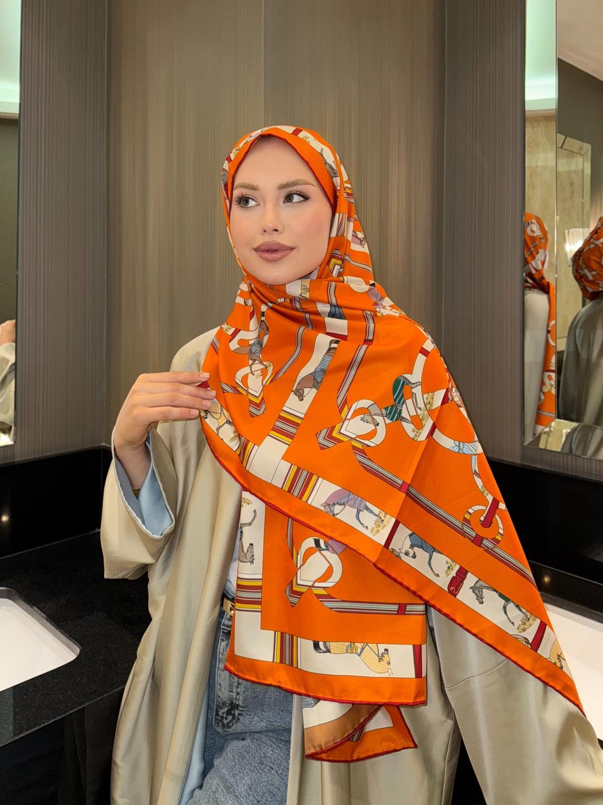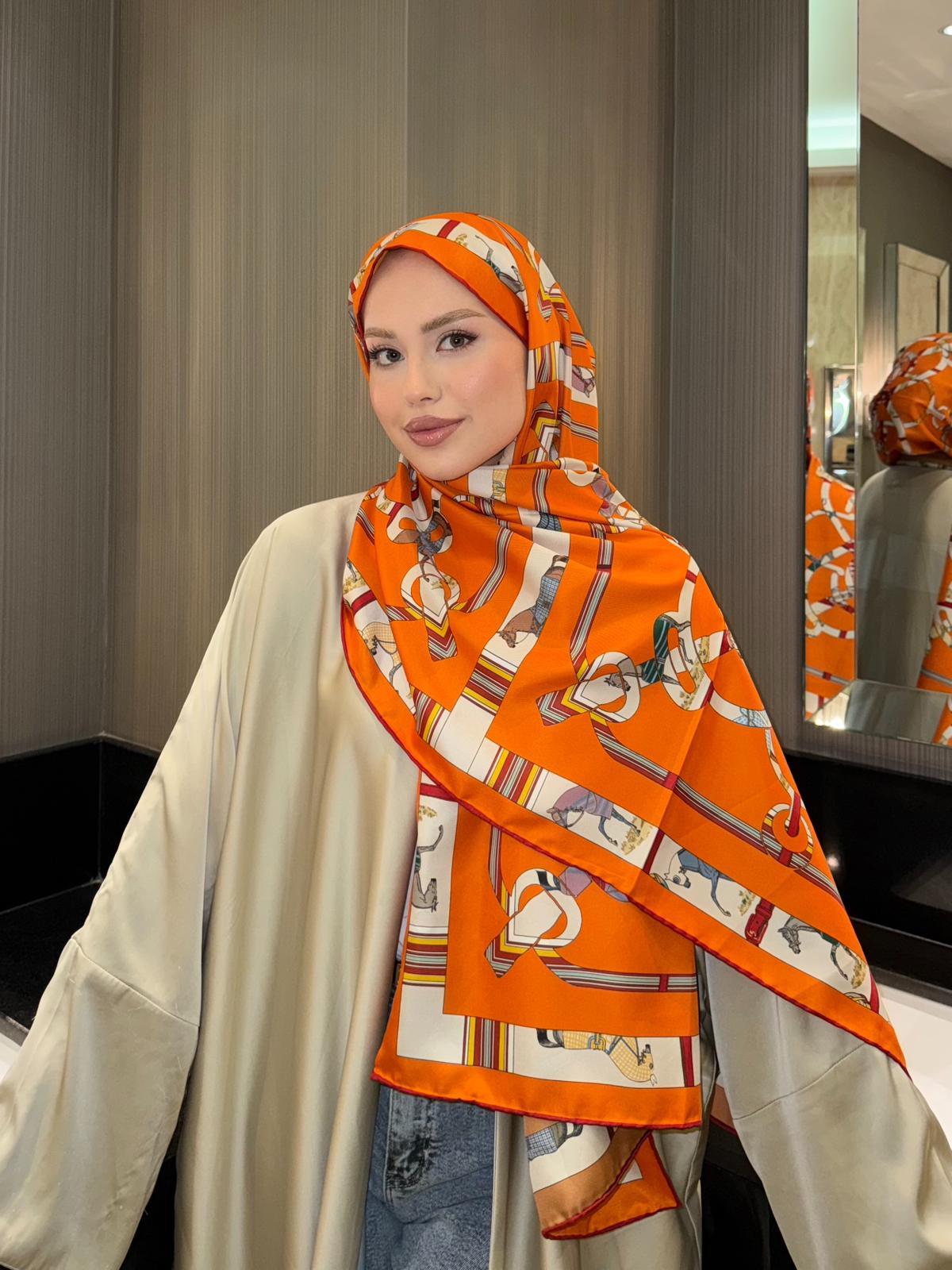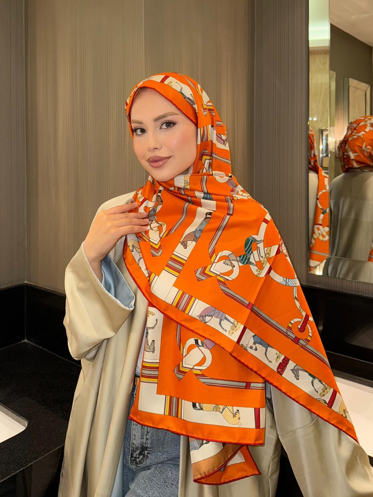İthal Turuncu & Mocha H Horse Desen Twill İpek Şal (LMS346)