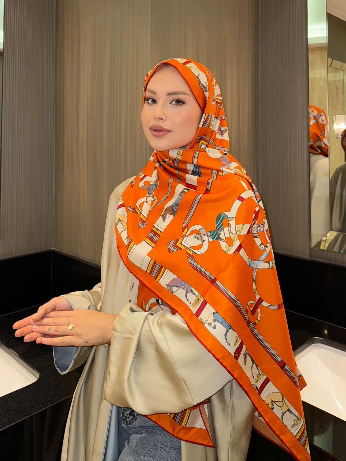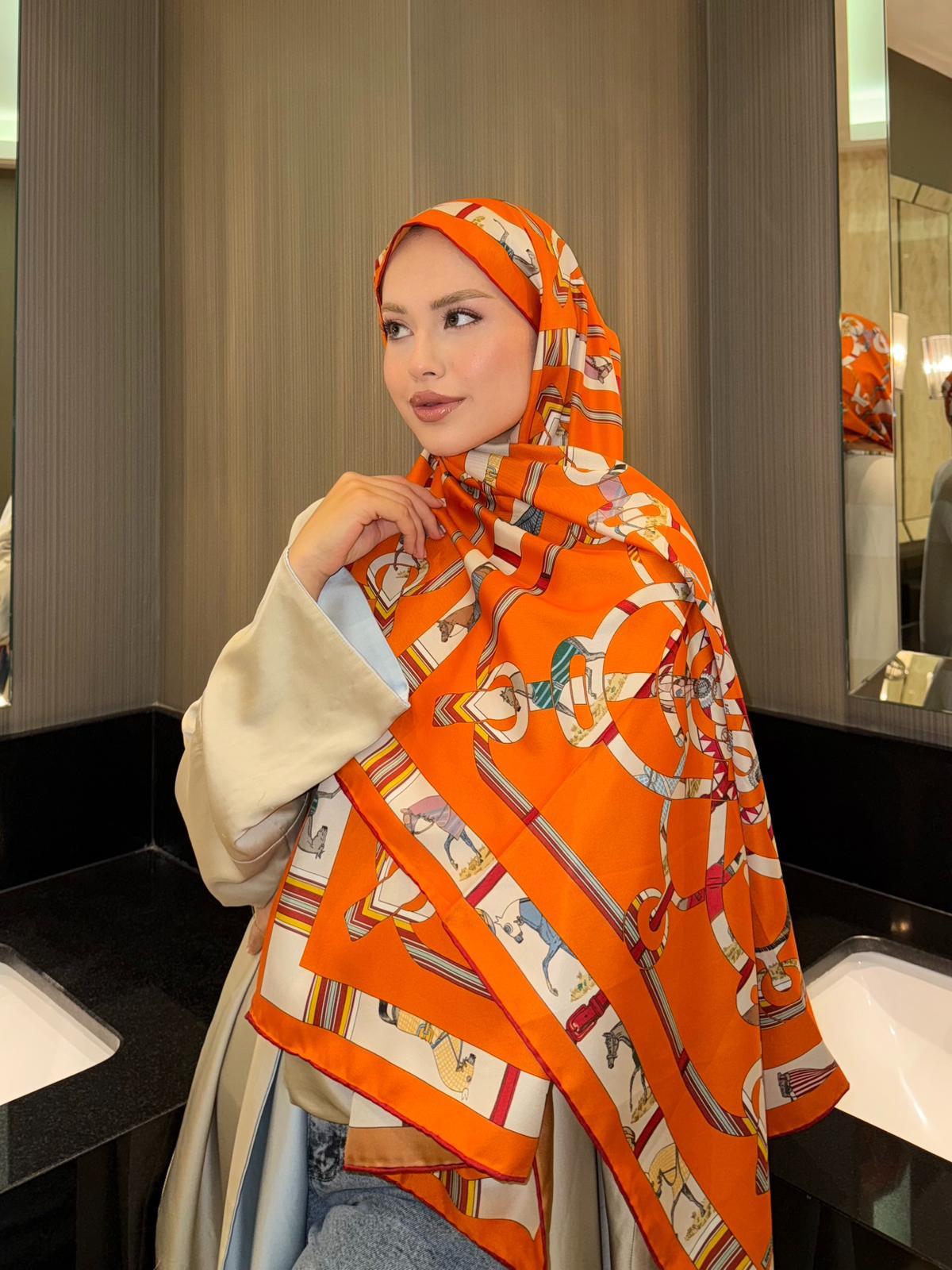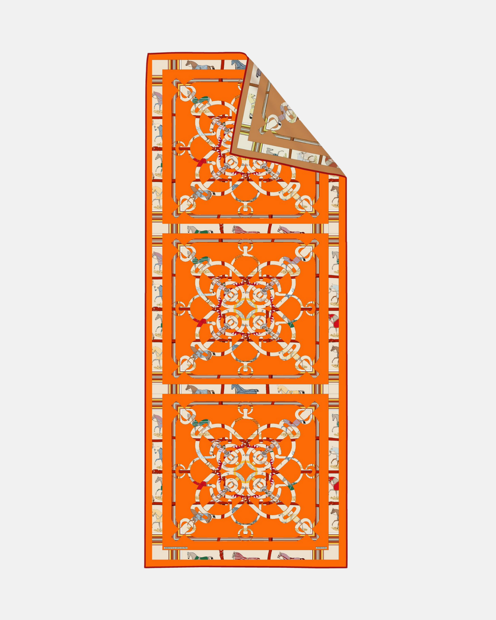 İthal Turuncu & Mocha H Horse Desen Twill İpek Şal (LMS346)