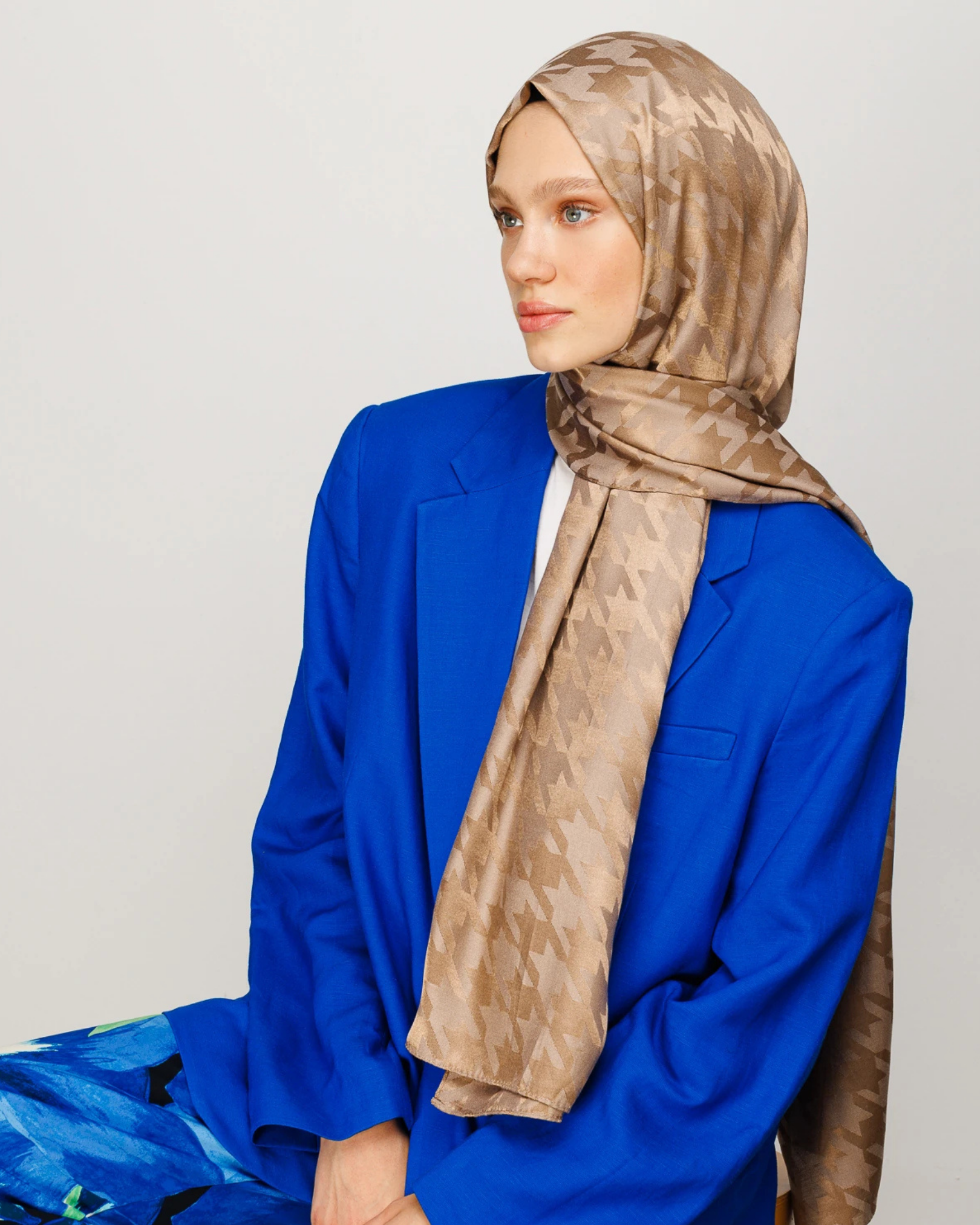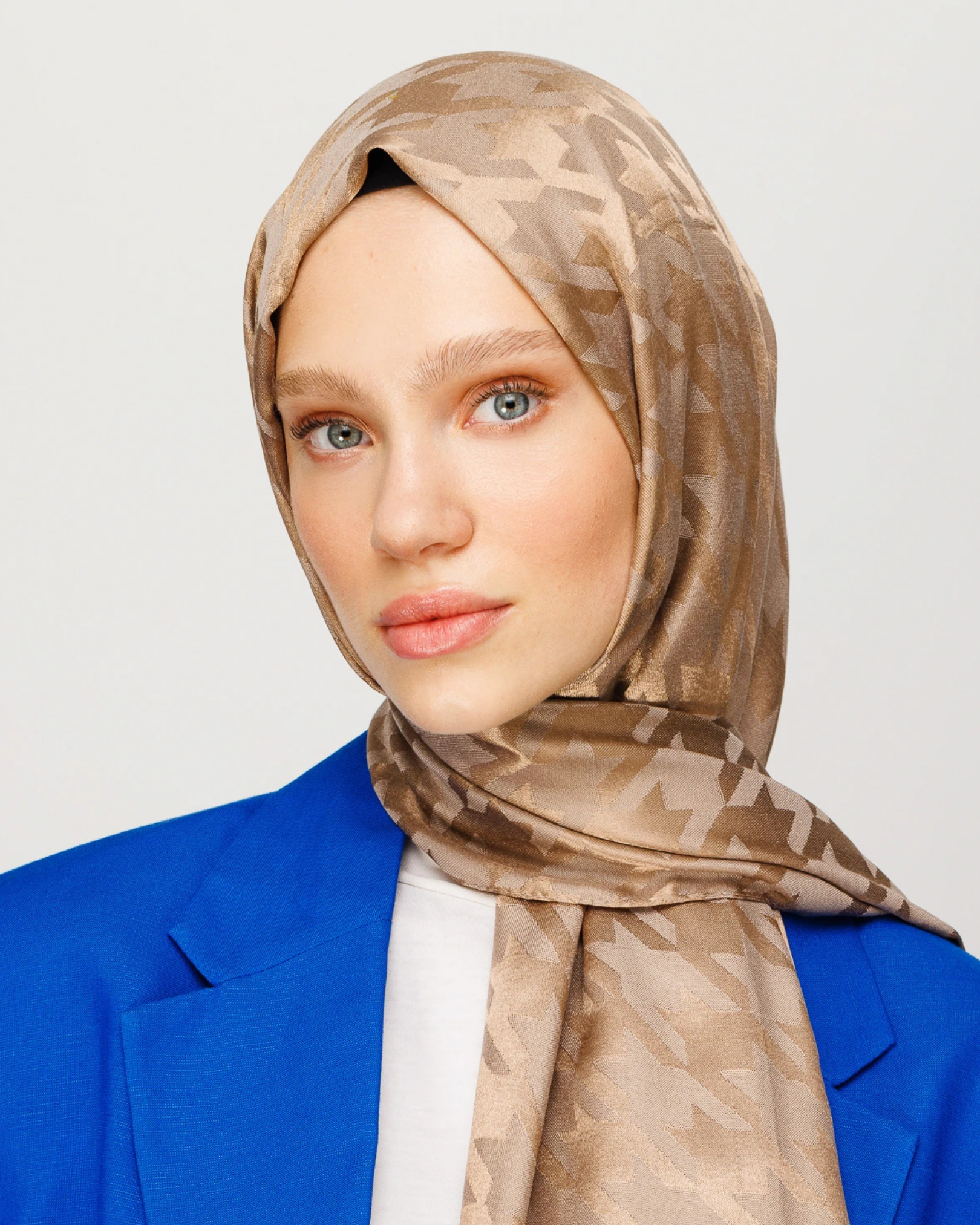 Kahverengi Kazayağı Desen Parlak Jakar Şal (JKRMNC0017)