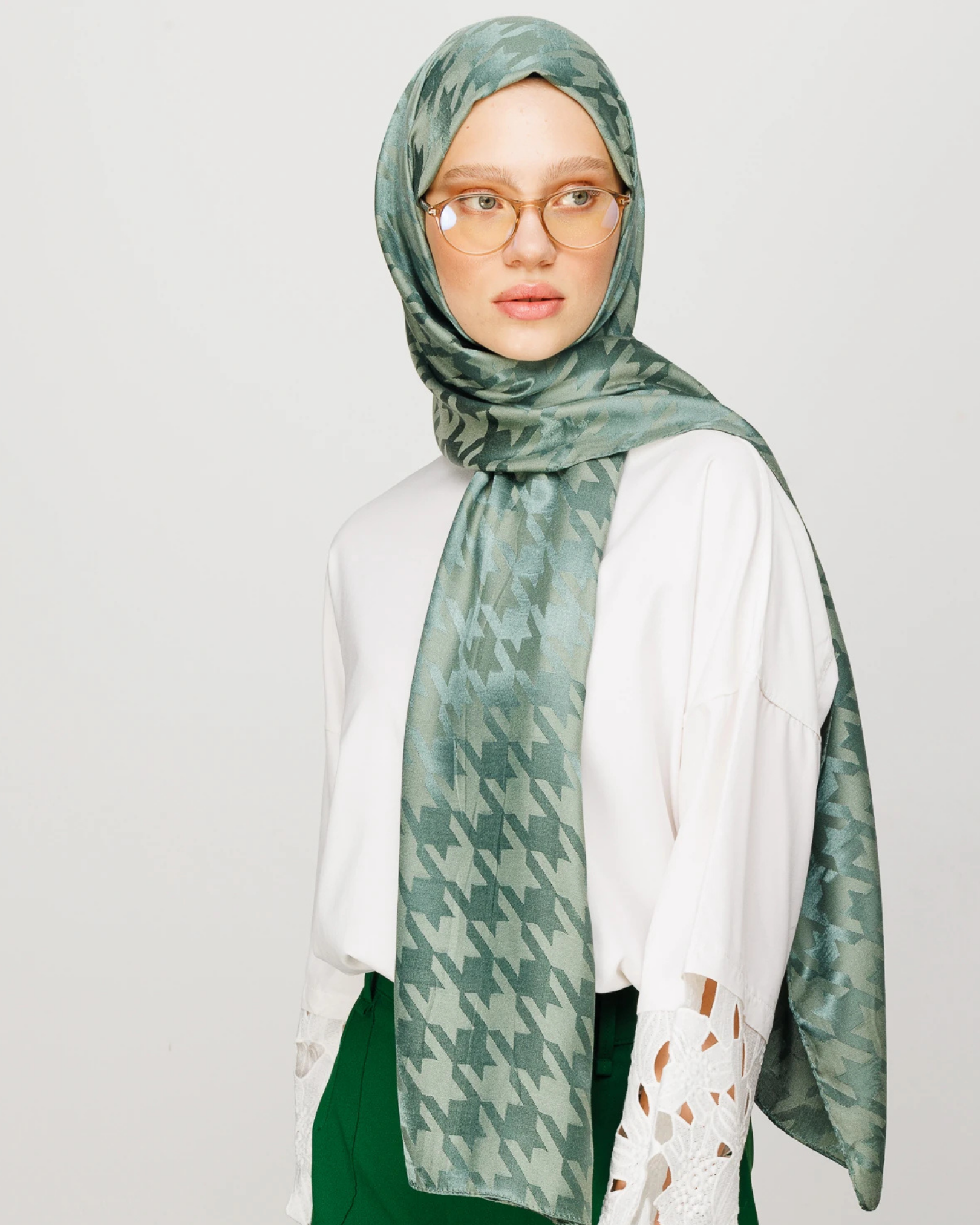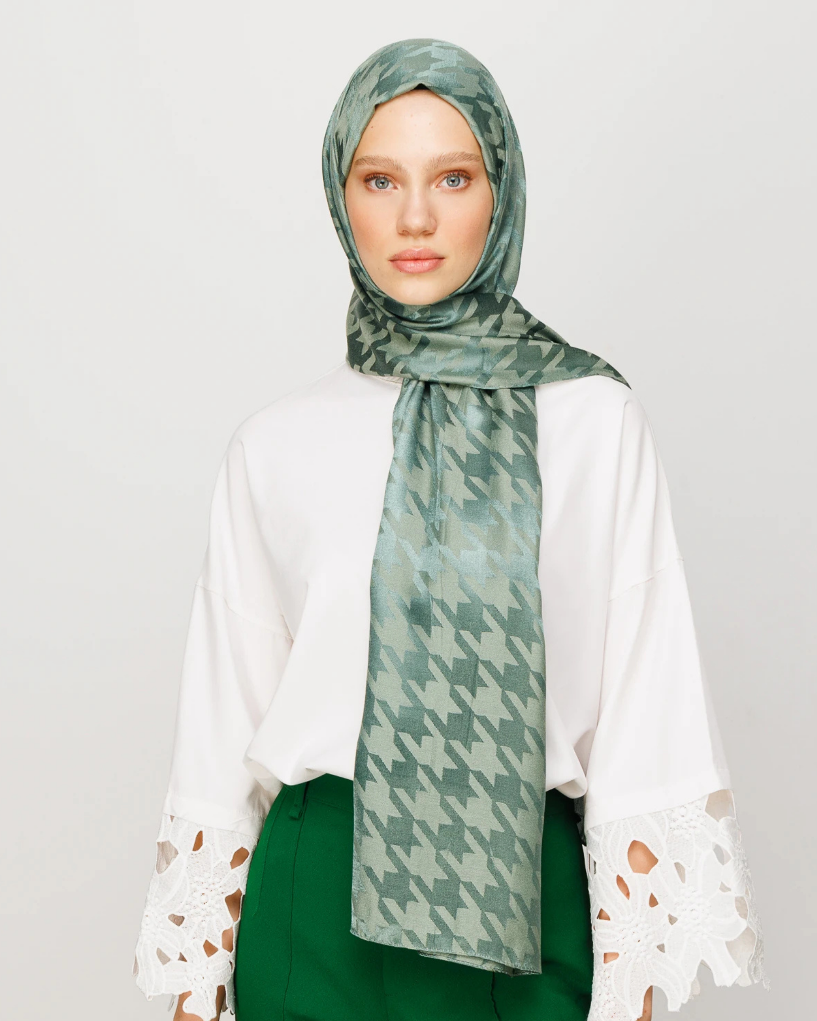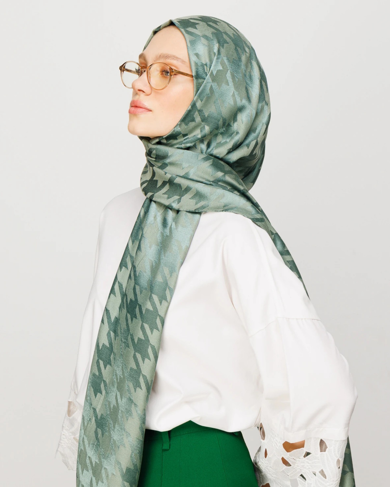 Küf Yeşili Kazayağı Desen Parlak Jakar Şal (JKRMNC0017)