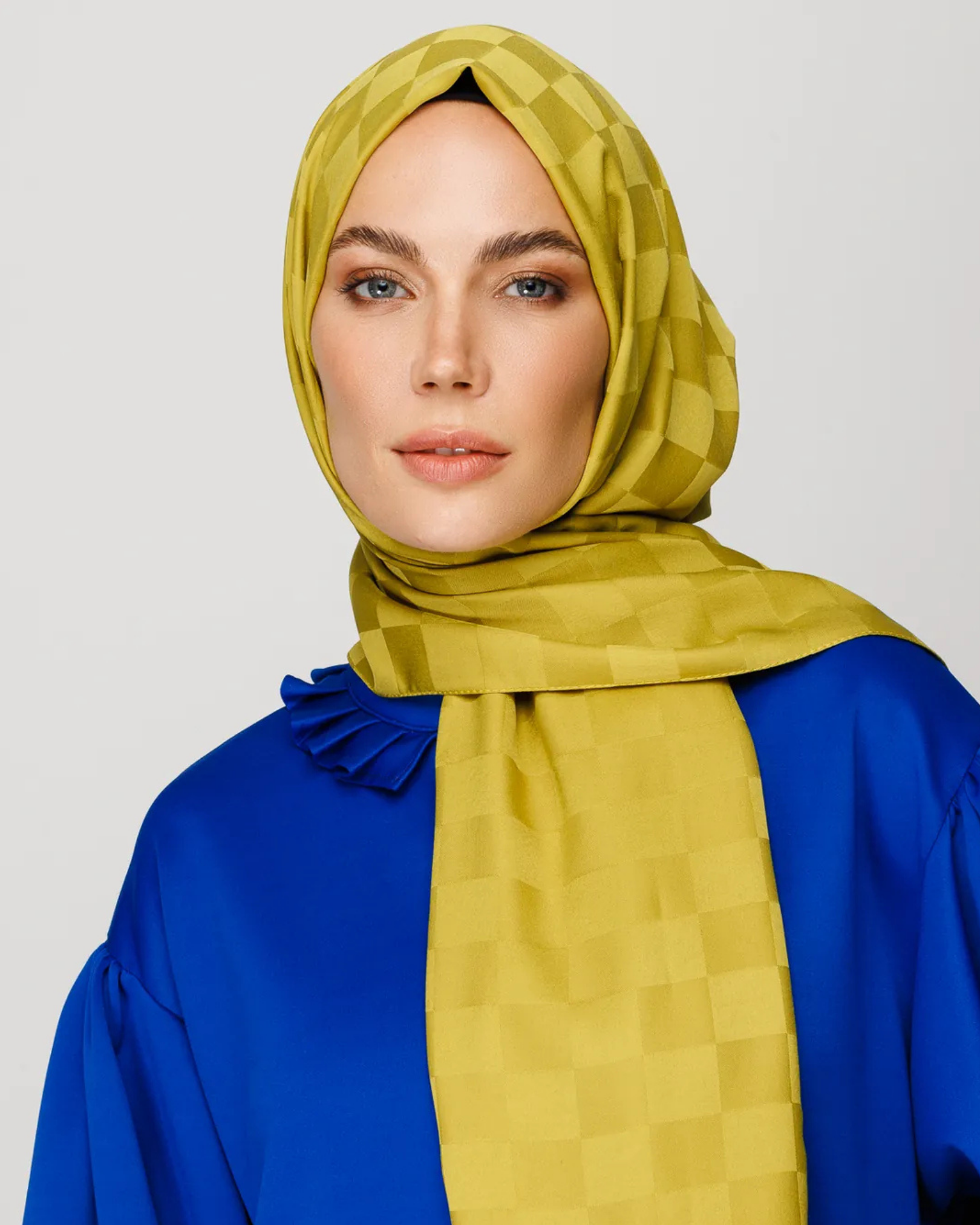 Oliv Yeşili Dama Desen İpeksi Jakar Şal (JKRMNC0014)